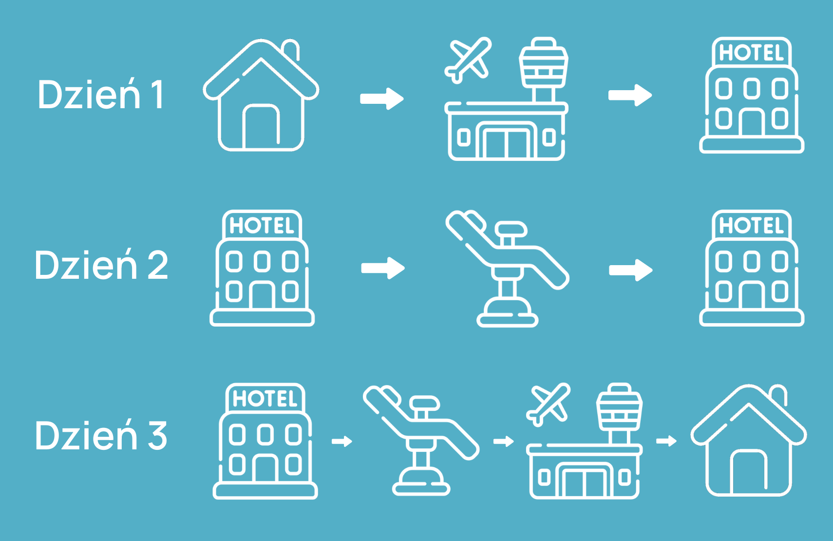 Klinika prowadzi pacjenta przez każdy etap — od konsultacji, przez dzień zabiegu, aż po opiekę pozabiegową i zalecenia po powrocie do kraju. Dzięki temu cały pobyt przebiega sprawnie, komfortowo i bez zbędnych formalności, a procedura może zostać zrealizowana nawet w ciągu kilku dni (w zależności od dostępnych połączeń lotniczych).