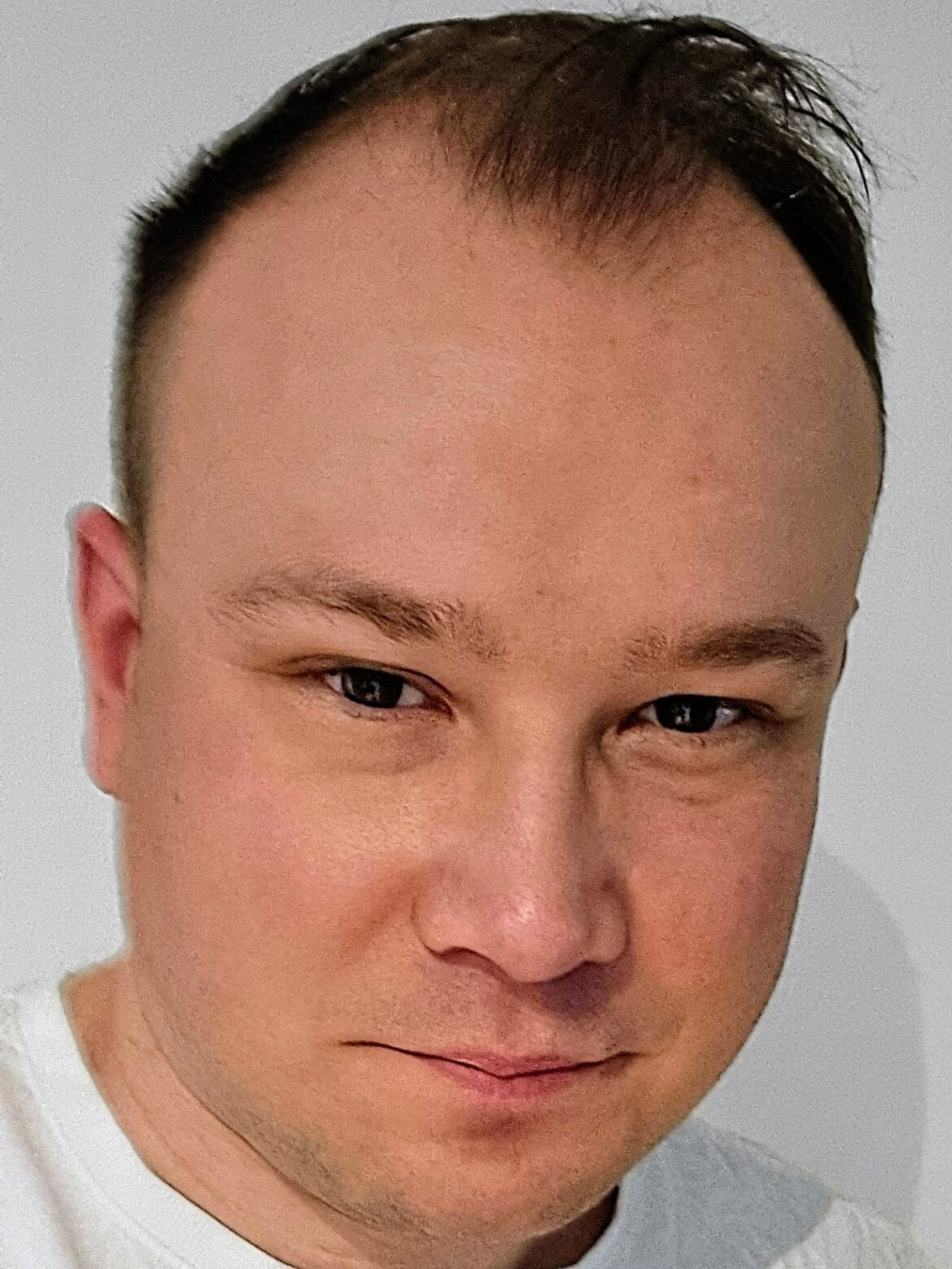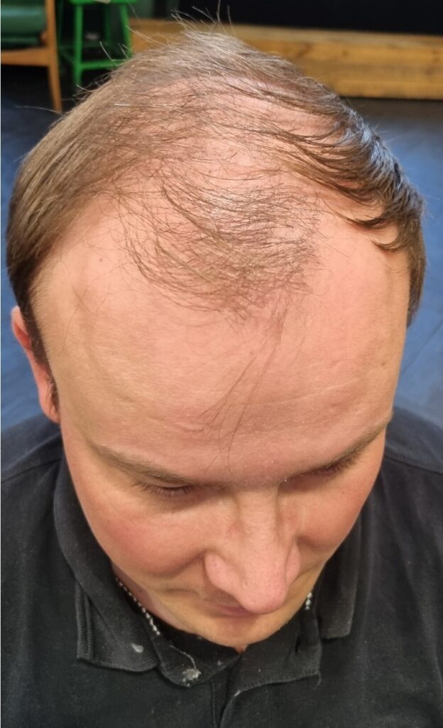 Pacjent z zaawansowanym cofaniem się linii włosów w okolicach skroni oraz rozproszonym przerzedzeniem na całej głowie.